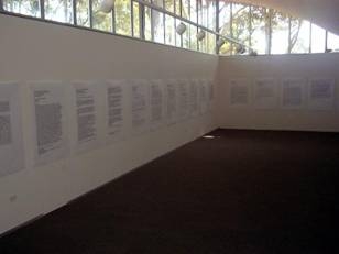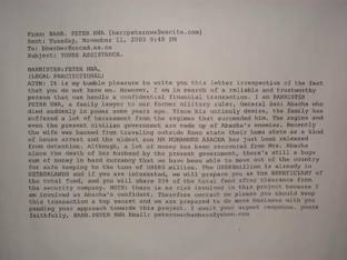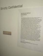 Strictly Confidential This exhibition consisted of a collection of over 100 messages fromAfrica, Asia and the Middle East) that the artist received via email from January 2003 to January 2004. Each letter solicited support to launder millions of dollars through the artist’s bank account. Four bound copies of the text Strictly Confidential containing several hundred email messages were placed on a shelf attached to the wall and 40 enlarged copies of the texts were pinned to walls of theGallery.