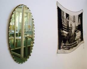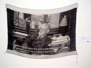 Freudian Slip Jacquard woven cloth 40”x30” with text and mirror. (Cloth woven by Robin Muller and Nancy Price). Text on cloth reads “Looking into the face of a mirror that belonged to another person your soul may become trapped and manipulated by the dead host”.Photo courtesy of the FreudMuseum, Vienna